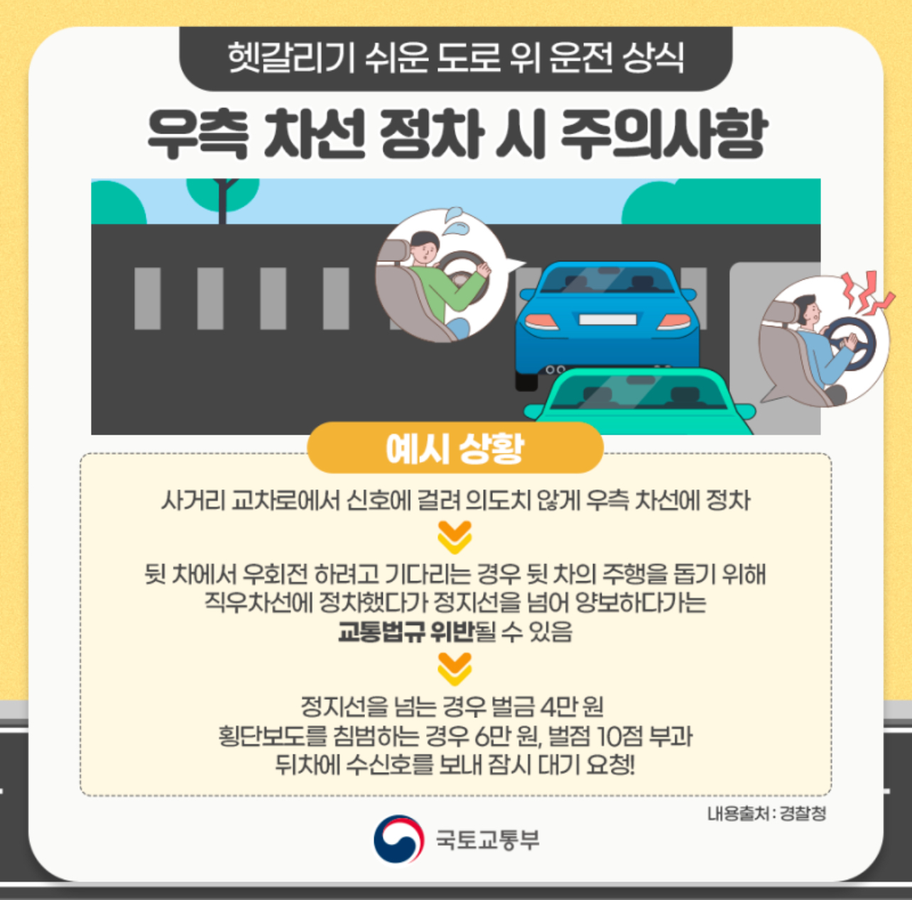 뒷 차에서 우회전하려고 기다리는 경우 뒤차의 주행을 돕기 위해 직우차선에 정차했다가 정지선을 넘어 양보하다가는 교통법규 위반될 수 있음