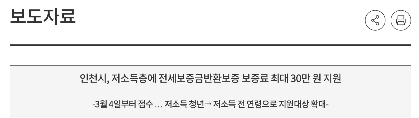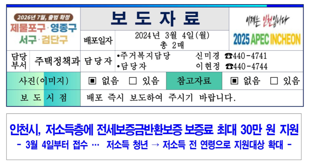 인천광역시는 최근 전세사기 피해사례 증가에 따라 2024년 3월 4일부터 ‘전세보증금반환보증 보증료 지원사업’을 접수한다고 밝혔습니다.