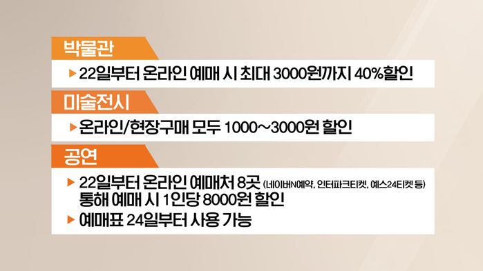 온라인으로 예매하면 최대 3천원(1인당 5장 한도)을 할인해준다. 미술 전시는 온라인 예매(1인 4장 한도)와 현장구매(월 1인 6장 한도) 모두 1천~3천원 할인받을 수 있다.