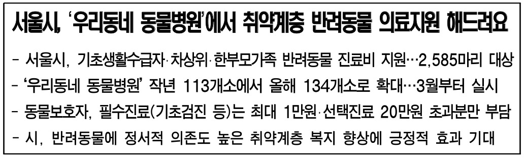 서울시는 취약계층 반려동물 의료 지원 사업인 「우리동네 동물병원」사업을 오는 2025년 3월부터 시작한다고 밝혔습니다.