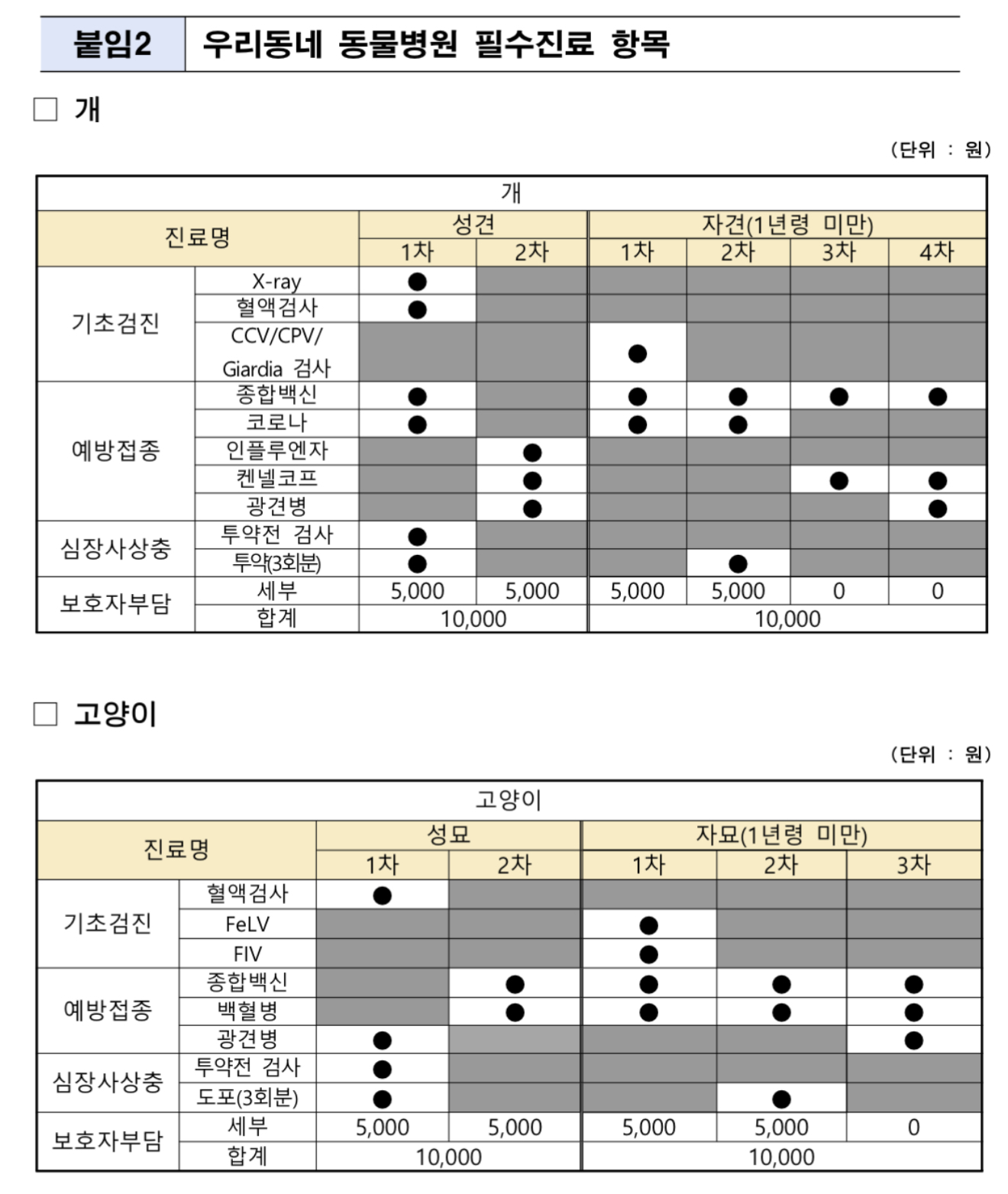 지원 항목은 ▲필수진료(기초건강검진, 필수 예방접종, 심장사상충 예방약)와 ▲선택진료(기초건강검진 중 발견된 질병 치료, 중성화수술)로 동물보호자는 필수진료는 1회당 진찰료 5천 원(최대 1만 원), 선택진료는 20만 원을 초과하는 금액만 부담하면 됩니다.