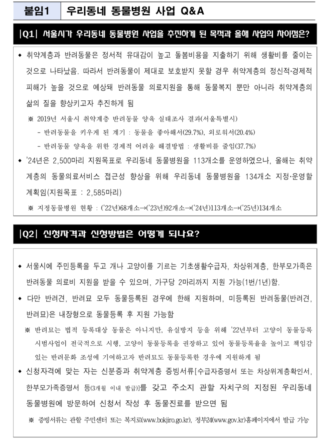 서울시는 반려동물을 양육하는 취약계층의 경우, 평상시 양육비뿐 아니라 반려동물이 아플 때 지출해야 하는 진료비에 대한 부담이 커 이를 완화하기 위해 2021년부터 ‘우리동네 동물병원’ 사업을 시작했으며 2022년 1,388마리, 2023년 1,864마리, 2024년 2,539마리의 진료비를 지원한 바 있습니다.