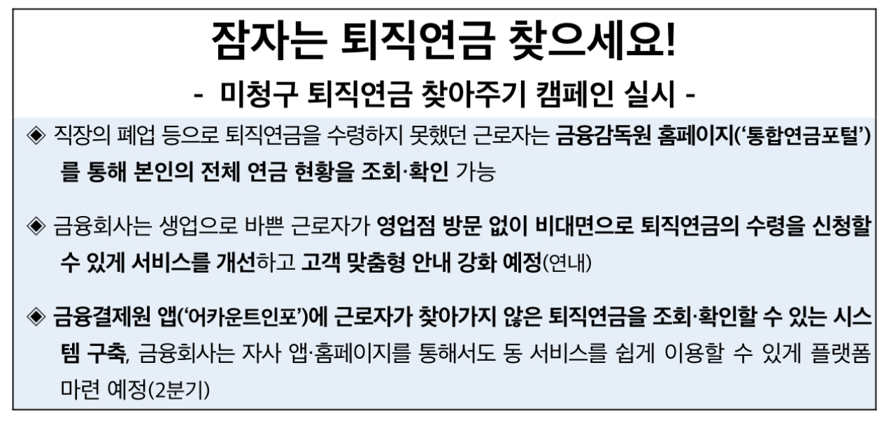 이에 고용노동부, 금융위원회, 금융감독원 및 금융회사는 가입자가 자신의 모든 퇴직연금 적립금을 조회·확인할 수 있는 서비스(금융감독원의 ‘통합연금포털’)에 대한 가입자 안내·교육 강화, 미청구 퇴직연금 적립금을 조회·확인할 수 있는 추가 시스템 신설(금융결제원의 ‘어카운트인포’) 등 구체적인 실천방안을 마련했고 이를 시행할 예정이라고 합니다.