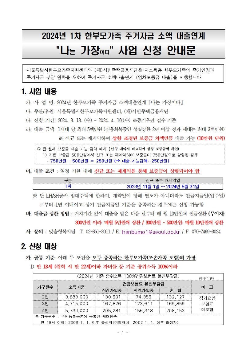 서울특별시한부모가족지원센터에서는 2024년 1차 한부모가족 주거자금 소액대출사업 "나는 가장이다" 대상자를 아래와 같이 모집하오니 임차 보증금 대출을 필요로 하는 한부모가족의 많은 신청 부탁드린다고 밝혔습니다.