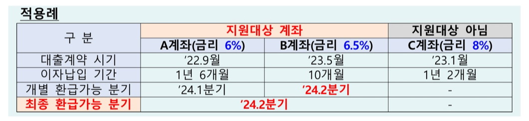신청이 접수되면 금융기관은 해당 차주가 이자를 1년 치 이상 납입했는지를 확인한 후 1년 치 이자가 모두 납입된 후 처음 도래하는 분기의 말일(영업일 기준, 1분기의 경우 3.29일)부터 6영업일 이내 환급금액을 “차주 명의의 원리금 자동이체 계좌*”에 입금하고 그 사실을 차주에게 문자로 알립니다.