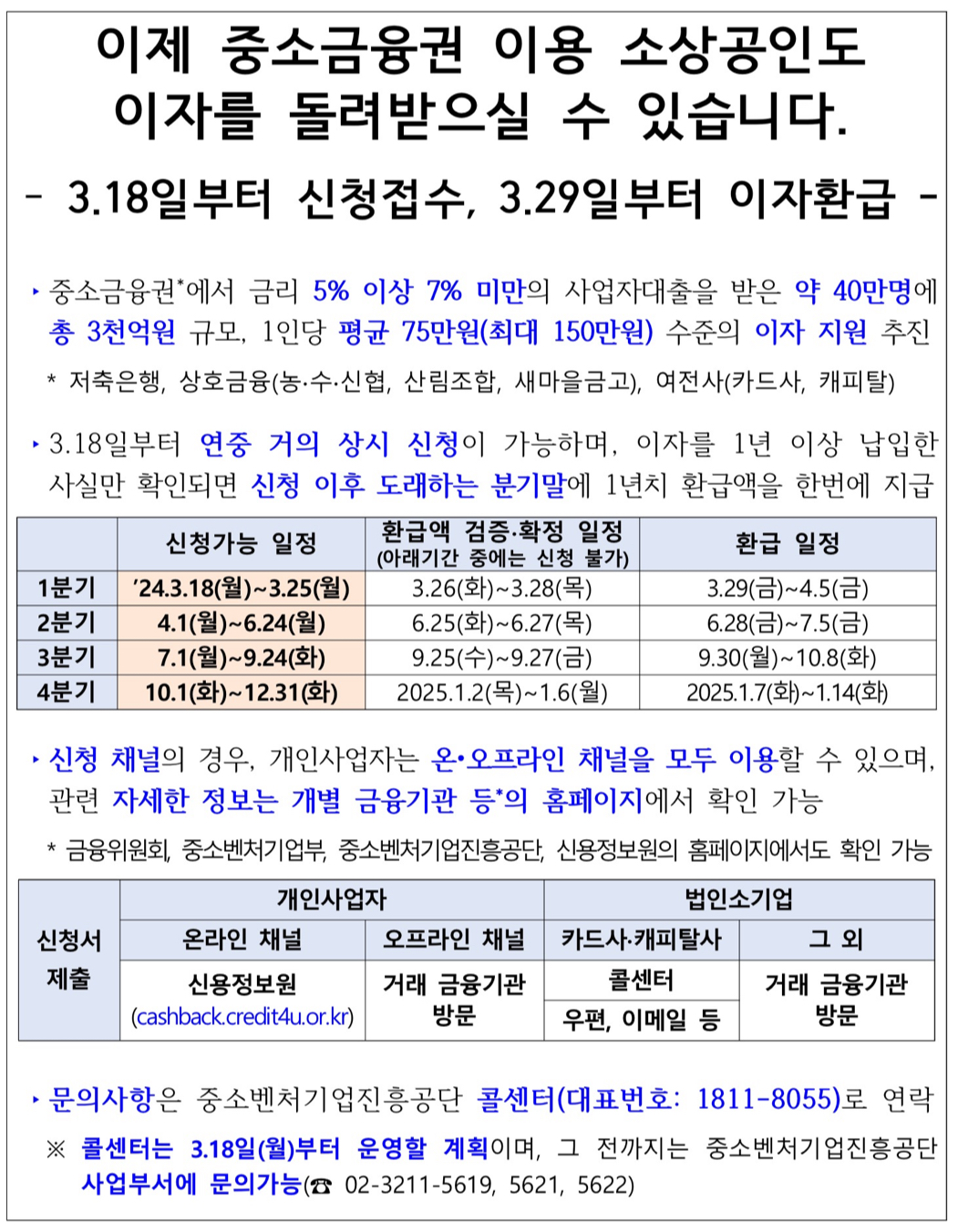 참고로 콜센터는 신청이 개시되는 2024년 3.18일(월)부터 운영될 예정이므로 그전에는 중진공 담당자를 통해 문의하실 수 있습니다. (☎ 02-3211-5619, 5621, 5622)
