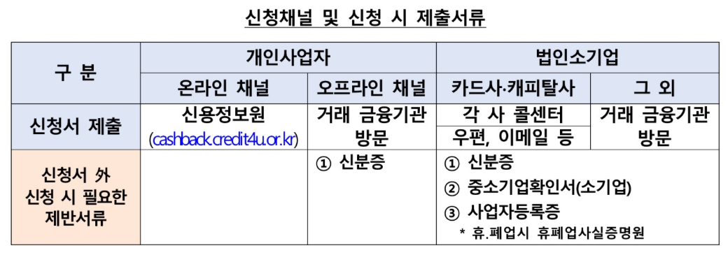 개인사업자인 경우, 거래 금융기관을 방문하지 않아도 신용정보원 온라인 신청시스템(cashback.credit4u.or.kr, 3.18일부터 개시)을 통해 신청이 가능합니다.