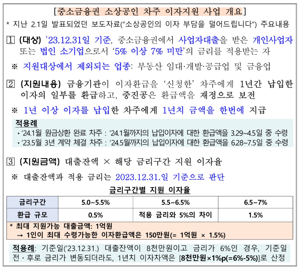 국회는 높은 금리, 경기회복 지연 등으로 어려움을 겪고 있는 소상공인의 금융부담을 덜어주기 위해 작년 12월 21일 중소금융권* 내 소상공인 차주 이자지원 재정사업 예산 3천억원(중소벤처기업창업및진흥기금)을 확정했습니다.