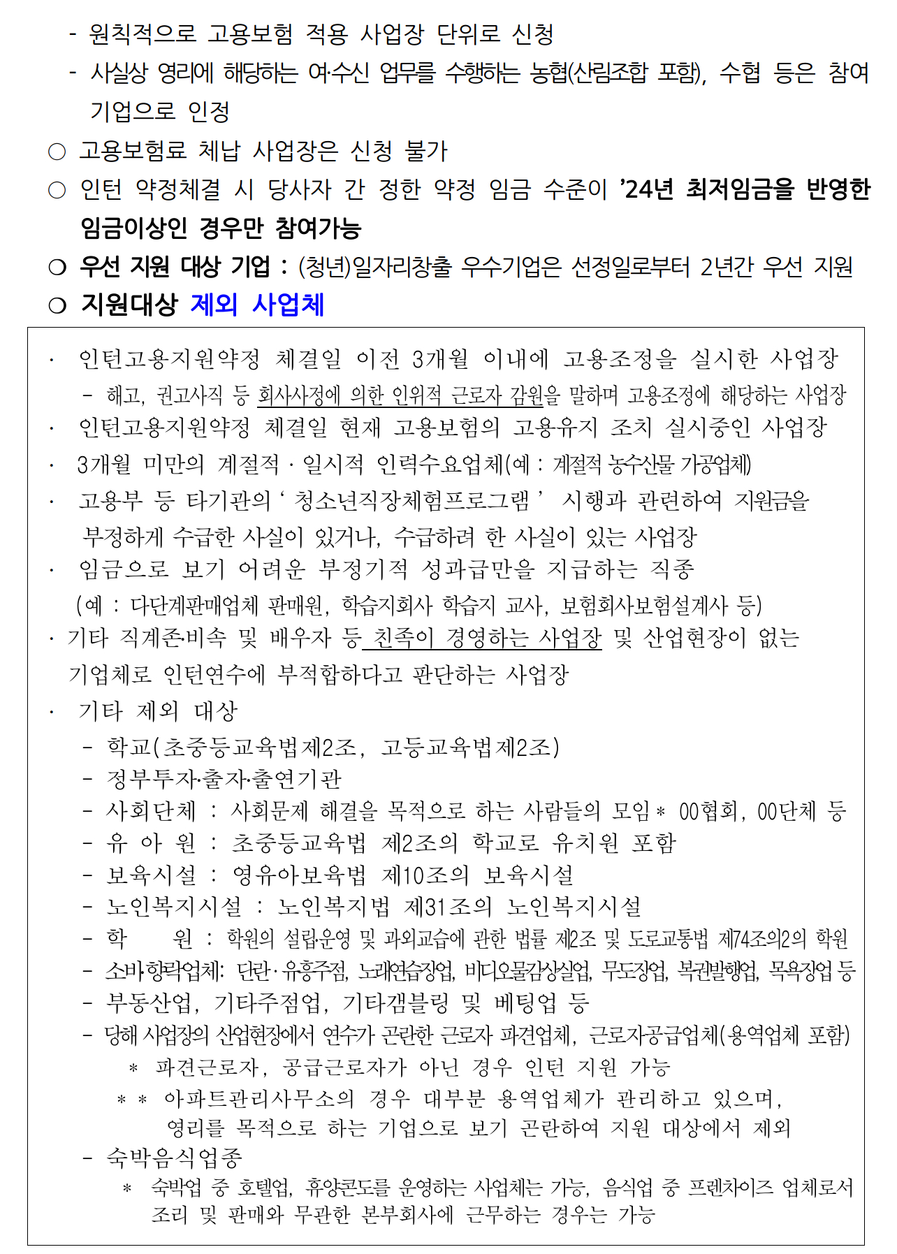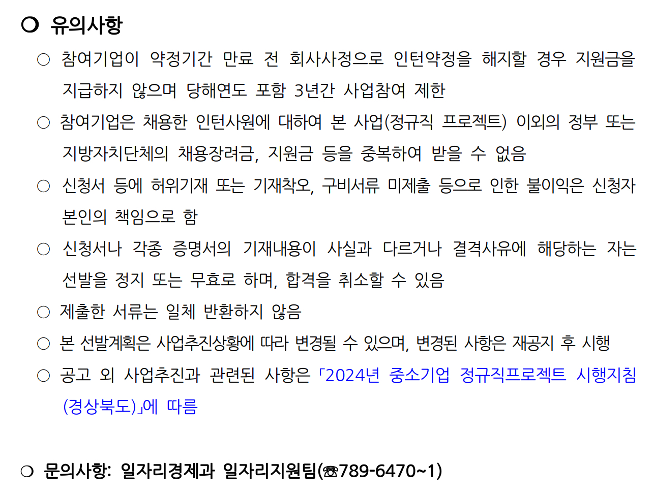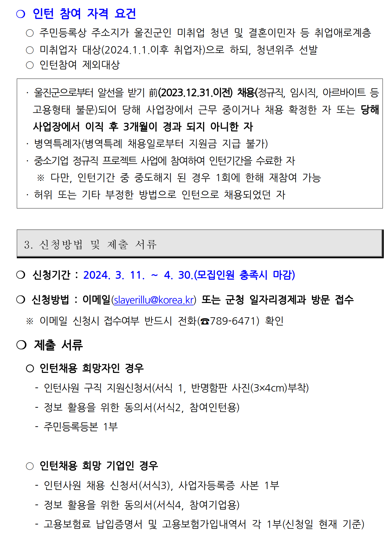 울진군에서 일자리를 알선받기 전(2023년 12월 31일 이전)에 해당 사업장에 근무 중이거나 당해 사업장에서 이직 후 3개월이 지나지 않고 병역특례자로 이전에 중소기업 정규직 프로젝트사업에 참여해 인턴 기간을 수료한 자는 참여할 수 없습니다.