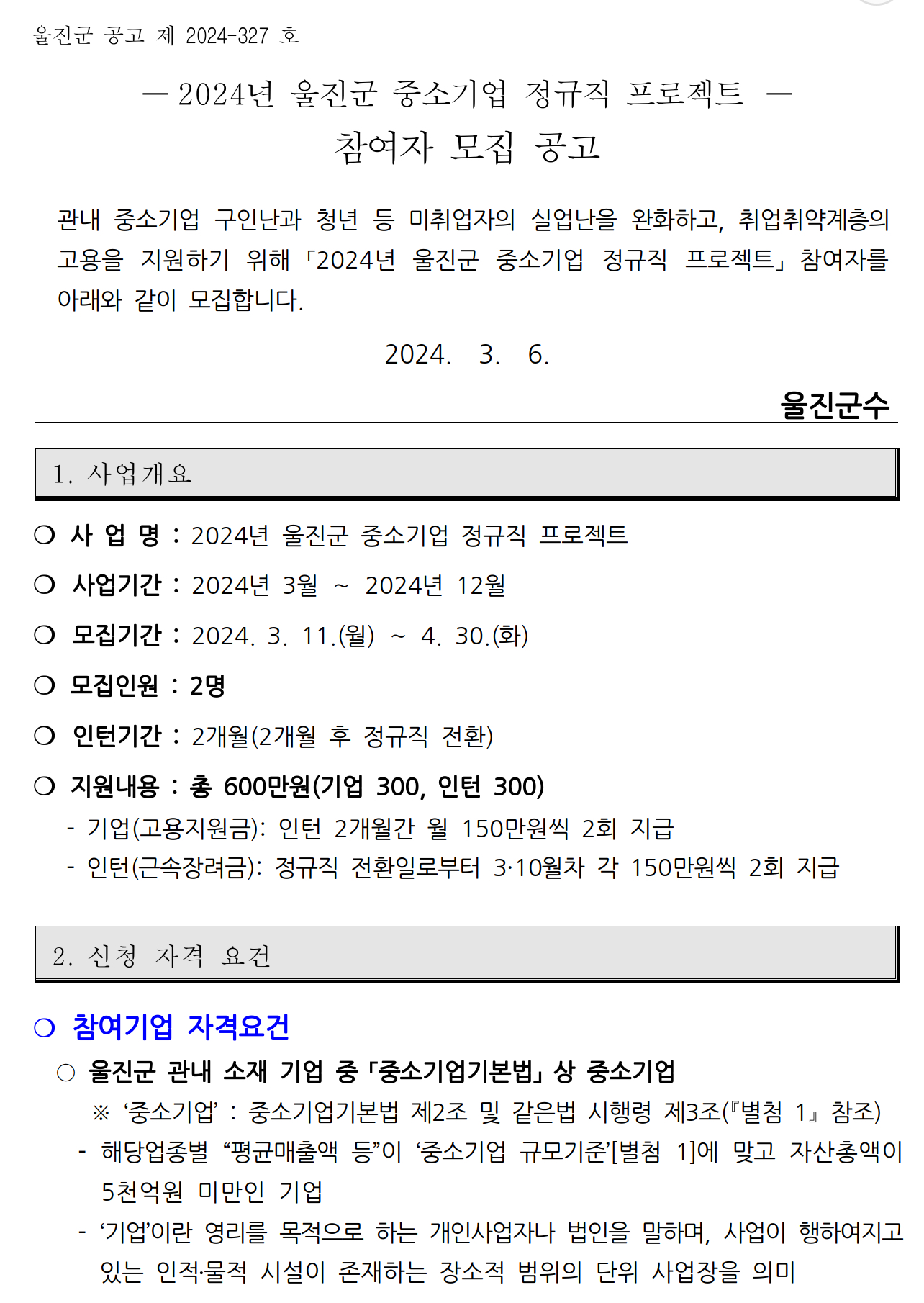 경북 울진군은 11일부터 오는 4월 30일까지 취업애로계층의 고용을 지원하기 위한 '2024 중소기업 정규직 프로젝트 사업' 참여자를 모집한다고 밝혔습니다.