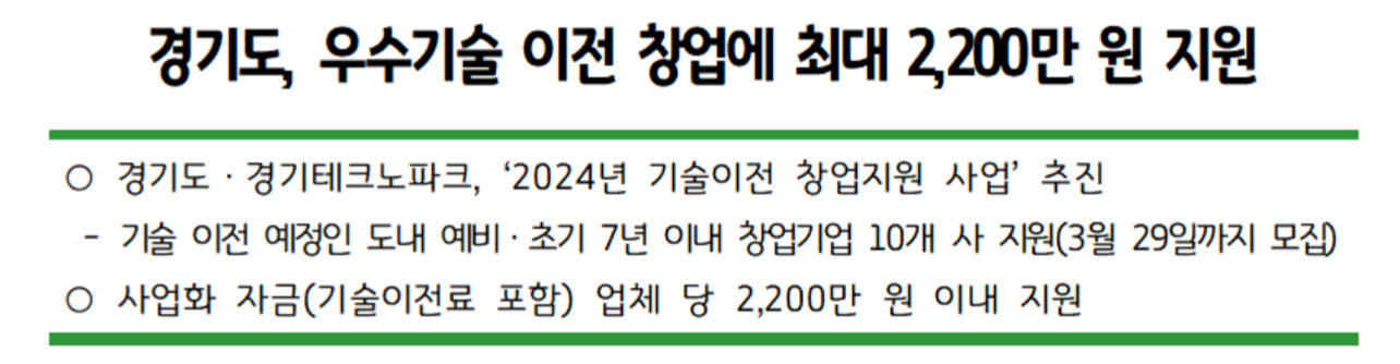 경기도와 경기테크노파크가 ‘기술이전 창업지원 사업’에 참여할 초기창업자를 2024년 3월 29일까지 모집한다고 합니다.