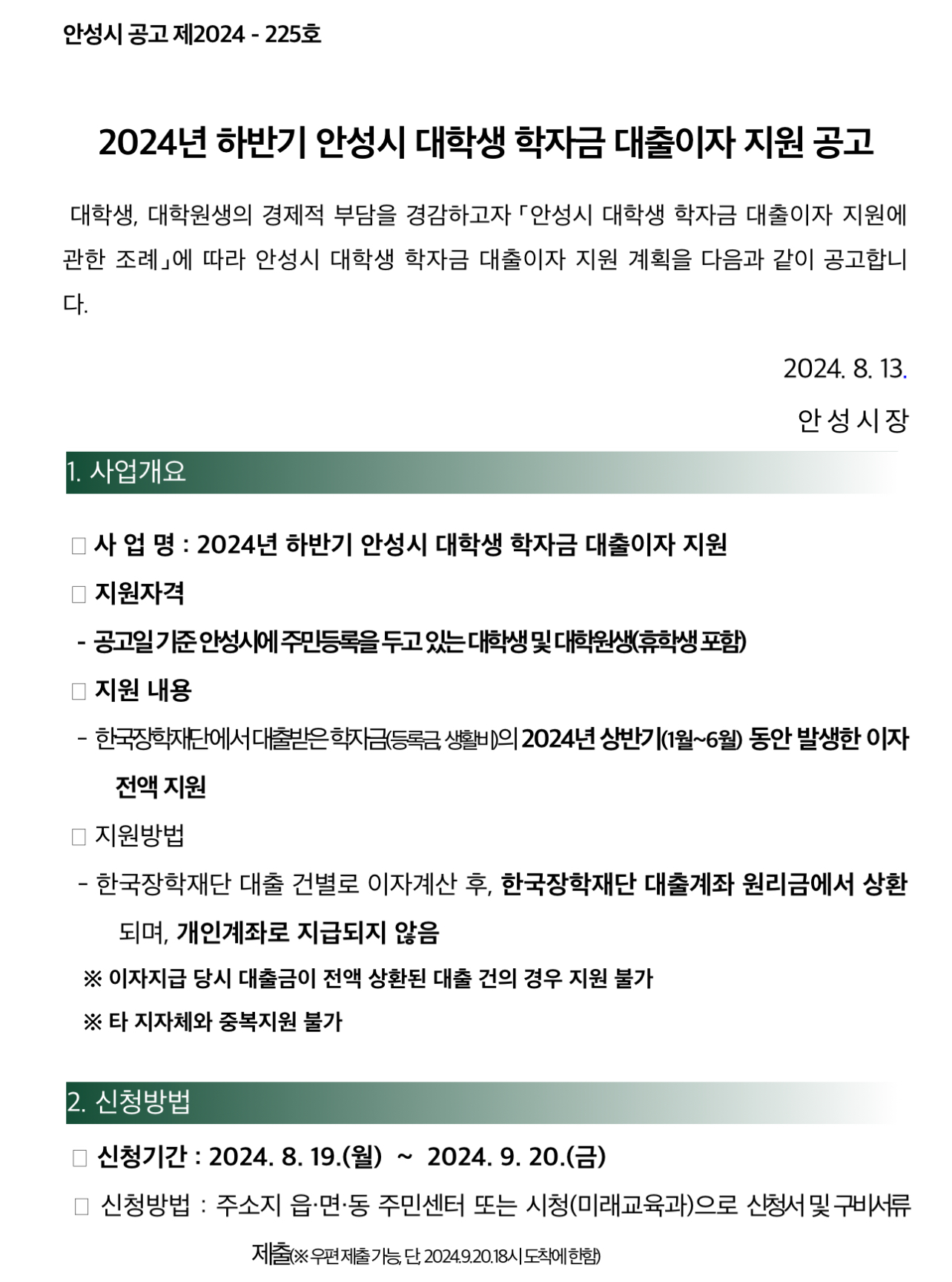 경기도 안성시는 오는 2024년 8월 19일(월)부터 9월 20일(금)까지 ‘2024년도 하반기 안성시 대학생 학자금 대출이자’ 지원 신청을 받는다고 밝혔습니다.