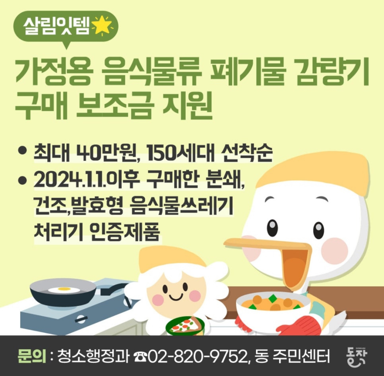동작구 음식물 쓰레기 처리기 설치비용 보조금은 가구당 1대에 한해 구입 금액의 50% 범위에서 최대 40만원까지라고 합니다.