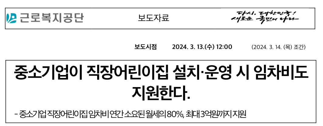 정부는 고용보험에 가입된 사업주(또는 사업주 단체)가 직장어린이집을 설치·운영하면 소요비용의 일부를 사업주에게 지원하는데 2024년 올해부터 중소기업의 경우「직장어린이집 시설 임차비 지원」을 신설하여 연간 소요된 월세의 80%, 최대 3억원까지 지원한다고 합니다.