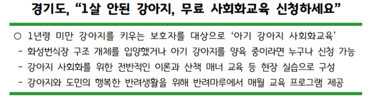 ‘아기 강아지 사회화 교육’은 경기도의 반려동물 문화교육 중 하나로 경기도는 매월 다양한 주제를 선정해 교육을 진행하고 있습니다.