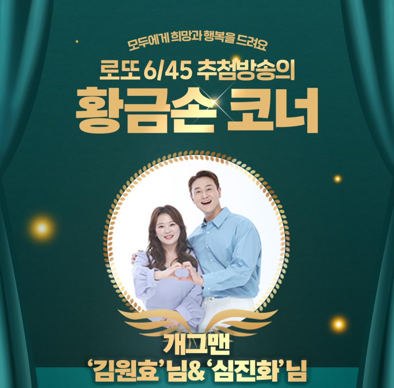 개그맨 김원효&심진화 부부가 1111회 MBC ‘생방송 행복드림 로또 6/45’ ‘황금손’으로 출연한다고 합니다.