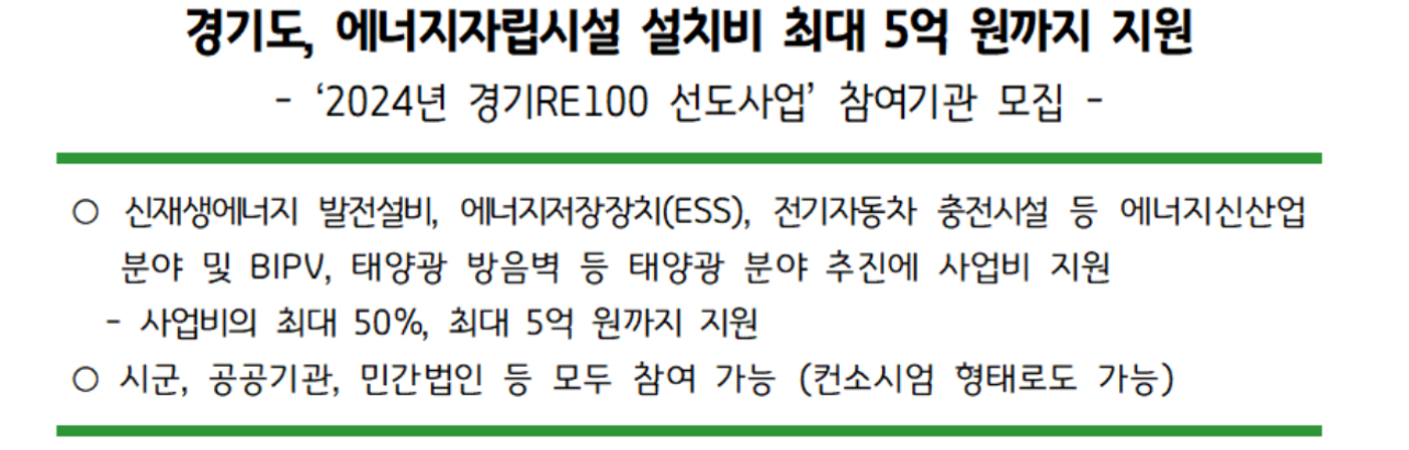 경기도가 분산에너지 활성화 특별법의 본격 시행에 앞서 기업 주도의 창의적이고 다양한 분산에너지 신사업 활성화를 위해 최대 5억 원까지 사업비를 지원하는 '2024년 경기RE100 선도사업'에 참여할 기관과 법인을 다음 달 2024년 4월 22일부터 26일까지 모집한다고 합니다.