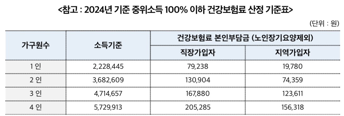 • 신청인이 속한 가구의 건강보험료 고지금액(신청일 전월의 고지금액)이 건강보험료 소득판정 기준표 상 기준 중위소득 100%의 건강보험료 본인 부담금 이하여야 함