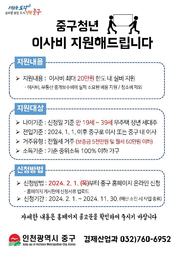 인천 중구는 2024년 올해부터 청년들의 주거 부담을 덜기 위해 ‘청년 이사비 지원사업’을 신규 도입·추진한다고 밝혔습니다.