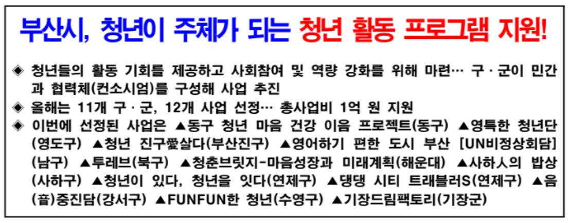 청년이 주체적으로 지역 소속감을 증대시키고 청년의 사회 참여 역량 개발을 지원하는 사업은 ‘영특한 청년단’(영도구), ‘청년 진구愛살다’(부산진구), ‘영어하기 편한 도시 부산 [UN비정상회담]’(남구), ‘청춘브릿지-마음성장과 미래계획’(해운대구), ‘기장드림팩토리’(기장군)가 선정됐습니다.
