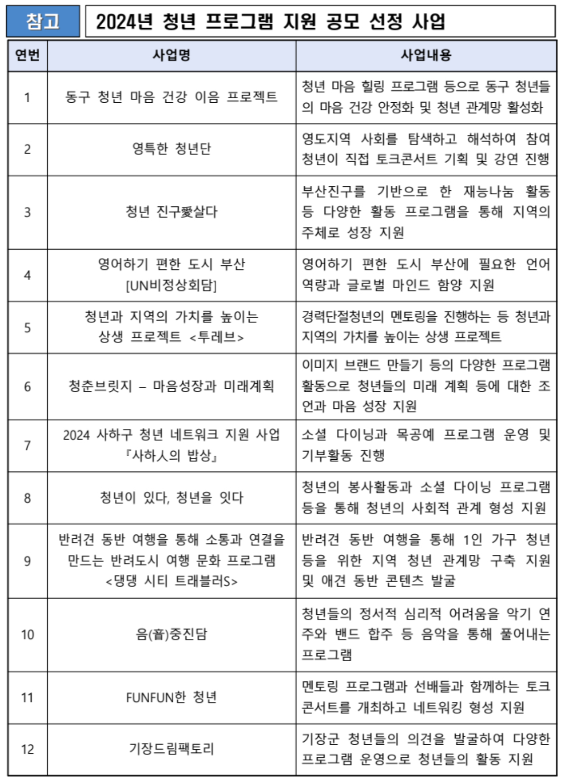 부산시(시장 박형준)는 2024년 3월 13일 「2024 청년 프로그램 지원 사업」 공모 결과를 발표한다고 밝혔습니다.