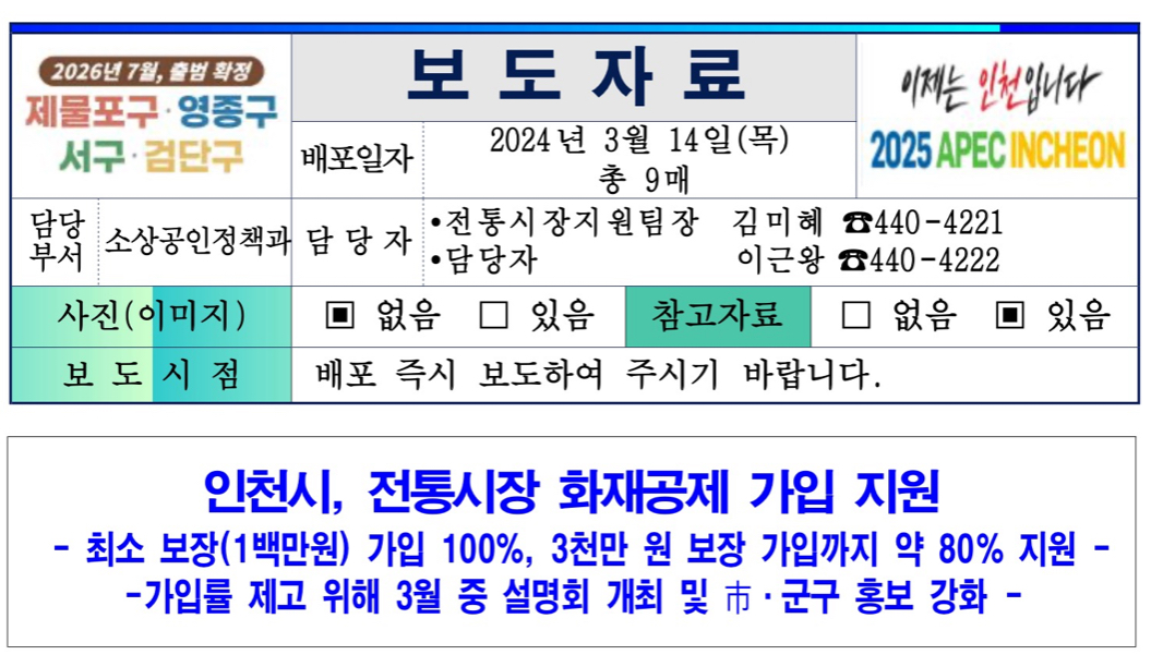 박찬훈 인천시 경제산업본부장은 “우리 시는 전통시장 화재 발생 시 상인들의 피해 복구 지원을 위해 우리 시는 올해도 화재공제 가입 지원사업을 적극 추진할 예정”이라면서 “전통시장 상인 여러분들의 적극적인 화재공제 가입을 요청드리며, 시는 앞으로 화재공제 가입률을 제고하기 위해 다각적인 노력을 기울이겠다”라고 밝혔습니다.