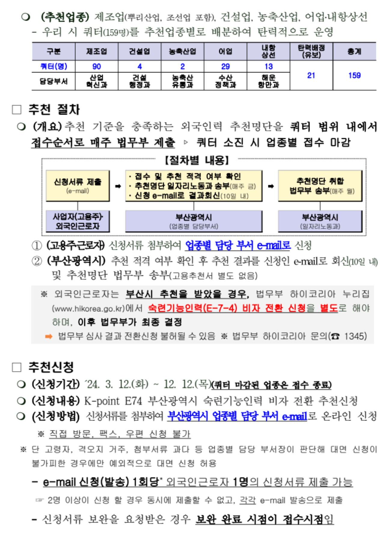 부산시는 특정 업종이 추천을 선점하지 않도록 추천 쿼터 159명을 추천업종별 등록외국인 수 비중에 따라 업종별(제조업, 건설업, 농축산업, 어업․내항상선)로 다시 배분해 모집한 다음, 추천할 계획이라고 합니다.