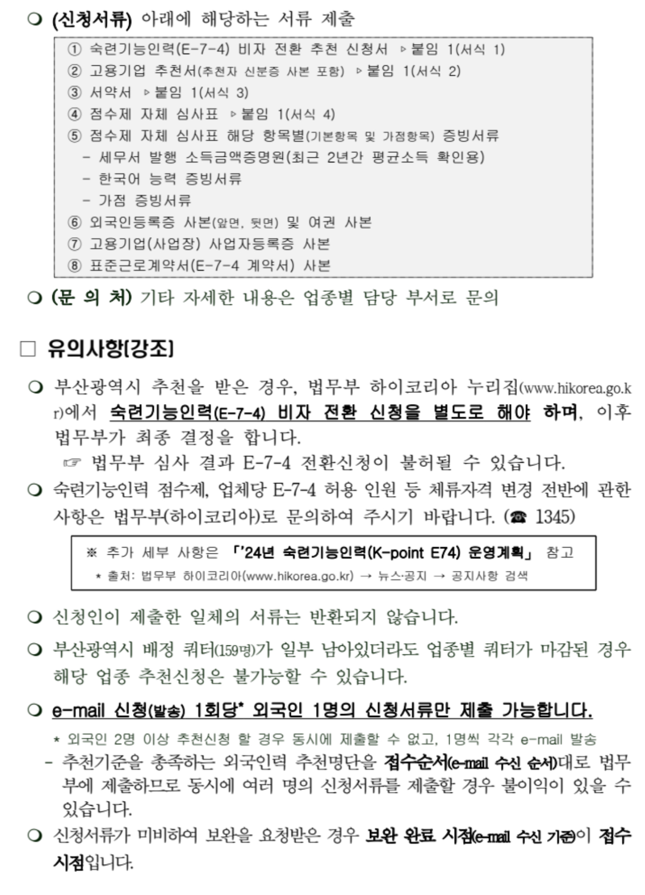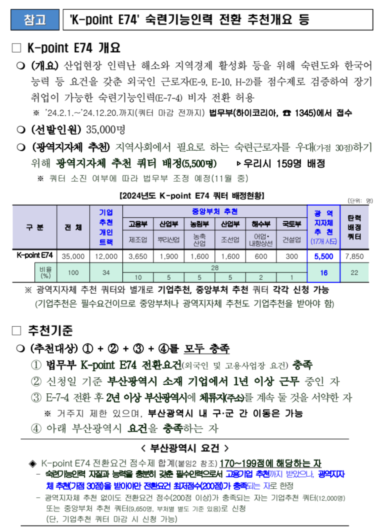 부산시는 법무부의 외국인 숙련기능인력 혁신적 확대 방안인 'K-point E74' 시행에 따라, 오는 2024년 12월 12일까지 '숙련기능인력 비자(E-7-4) 전환' 추천 대상자를 모집한다고 밝혔습니다.