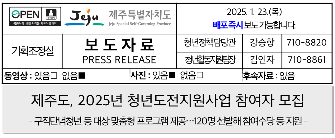 제주특별자치도는 구직단념청년 등을 대상으로 맞춤형 프로그램을 제공해 구직의욕을 높이고, 노동시장 참여 및 취업 촉진을 지원하는 ‘2025년 청년도전지원사업’을 2025년 2월부터 본격 운영한다고 합니다.