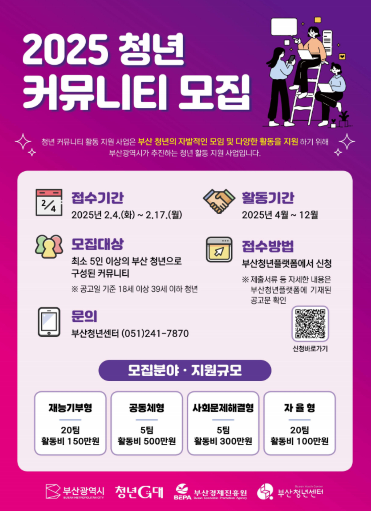 부산시는 2025년 2월 4일부터 오는 17일까지 ‘2025년 청년 커뮤니티 활동 지원 사업’에 참여할 팀을 모집한다고 밝혔습니다.