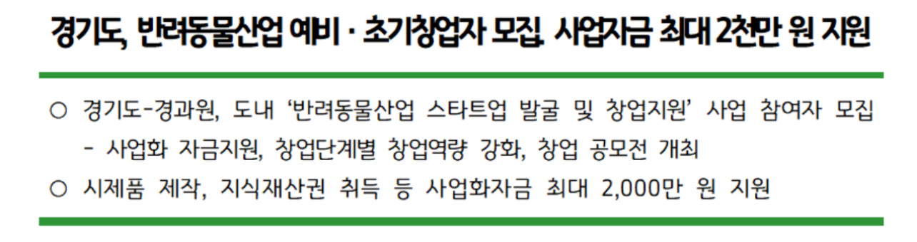 경기도와 경기도경제과학진흥원(이하 경과원)이 반려동물 연관 산업 육성을 위한 ‘반려동물산업 스타트업 발굴 및 창업지원’ 사업 참여자를 모집한다고 밝혔습니다.