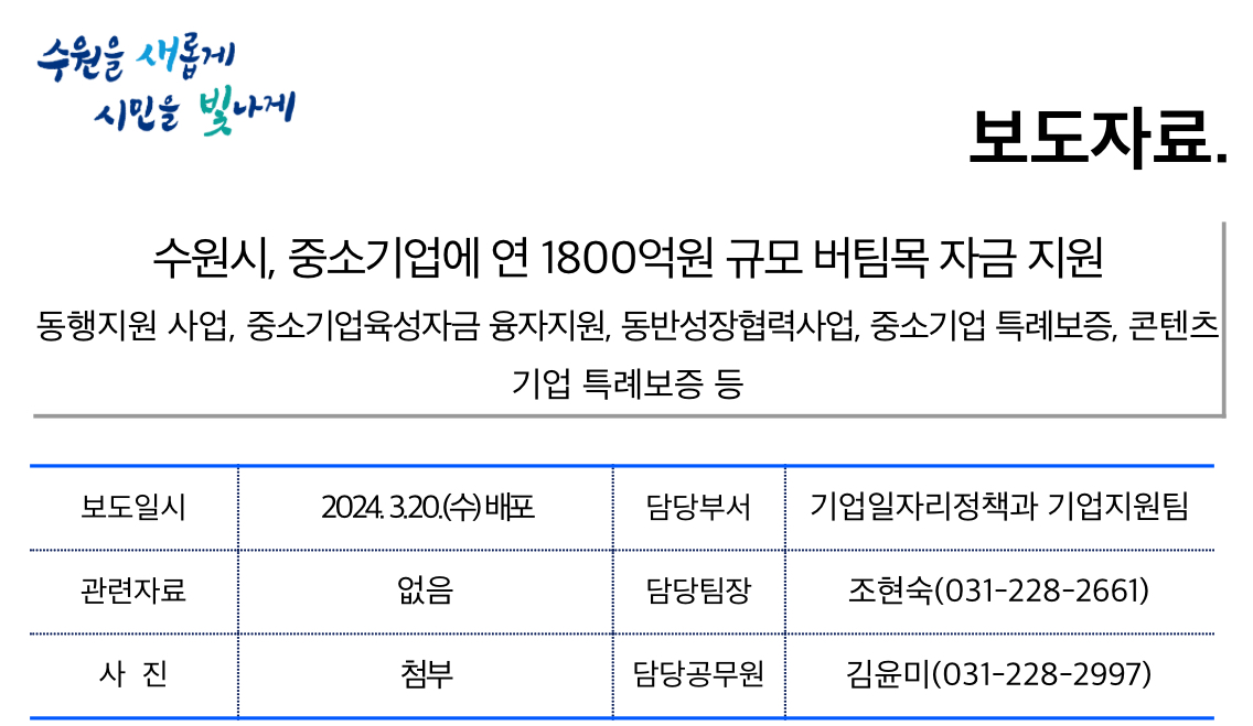 마지막으로 수원시 관계자는 “중소기업 버팀목 자금지원사업이 경제침체로 어려움을 겪고 있는 중소기업에 힘이 되길 바란다”며 “위기 속에서 흔들리지 않고 기업들이 새로운 도약을 준비할 수 있도록 앞으로도 적극 뒷받침해 나가겠다”라고 말했습니다.