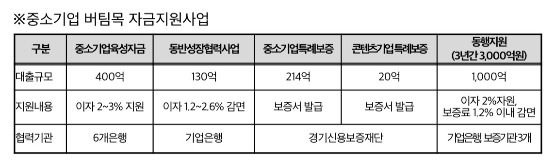 금융지원사업은 5개 분야로 ▲동행지원 사업 1000억 원 ▲중소기업육성자금 융자지원 400억 원 ▲동반성장협력사업 130억 원 ▲중소기업 특례보증 214억 원 ▲콘텐츠기업 특례보증 20억 원 등입니다.