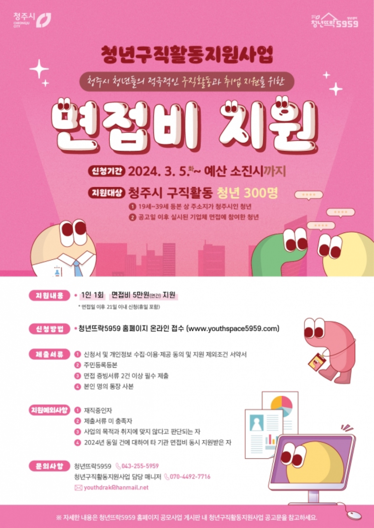 청주시 청년 면접비 지원 대상은 공고일(2024년 3월 5일) 이후 기업체 면접에 참여한 청주시 거주 19세~39세 청년 300명입니다.