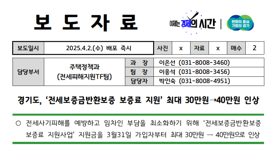 경기도는 전세사기피해를 예방하고 임차인의 부담을 덜어주기 위한 ‘전세보증금반환보증 보증료 지원사업’ 지원금을 기존 최대 30만 원에서 40만 원으로 인상한다고 밝혔습니다.