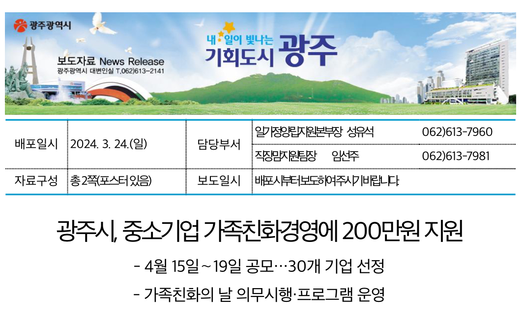 광주광역시일가정양립지원본부는 중소기업이 가족친화경영을 도입할 수 있도록 ‘2024년 중소기업 가족친화경영 지원 사업’에 참여할 기업을 공모한다고 말했습니다.