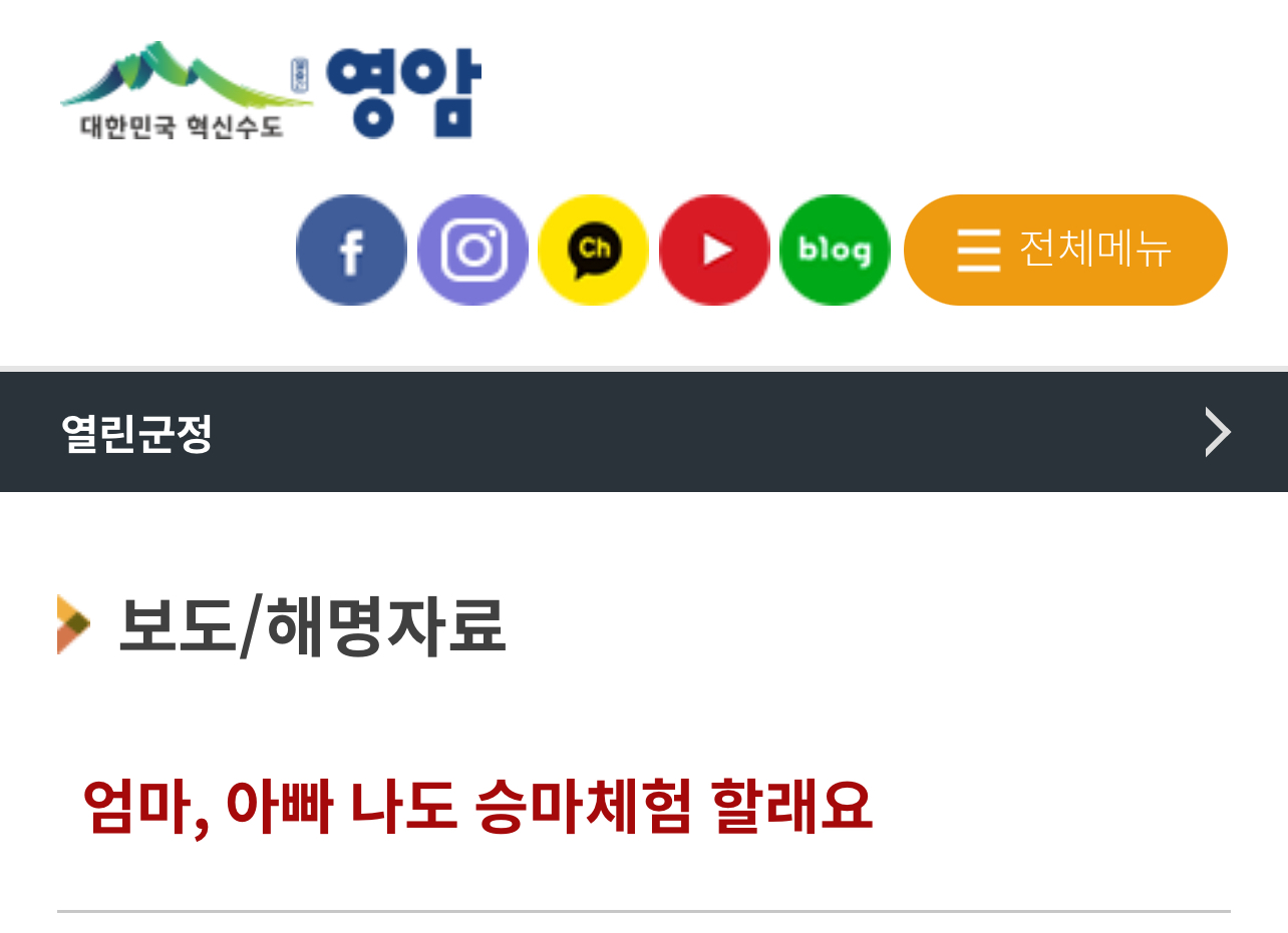 영암군(군수 우승희)은 4월 3일까지 ‘2024년 학생승마체험 지원사업’ 참여자를 모집한다고 밝혔습니다.