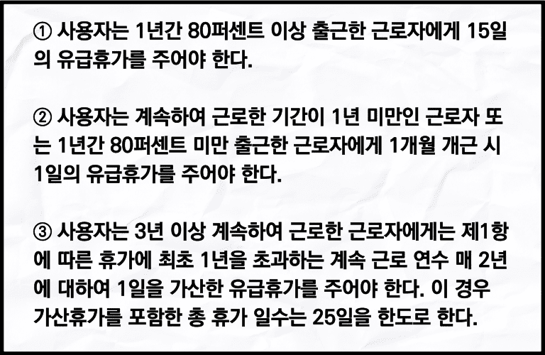 ① 사용자는 1년간 80퍼센트 이상 출근한 근로자에게 15일 의 유급휴가를 주어야 한다.