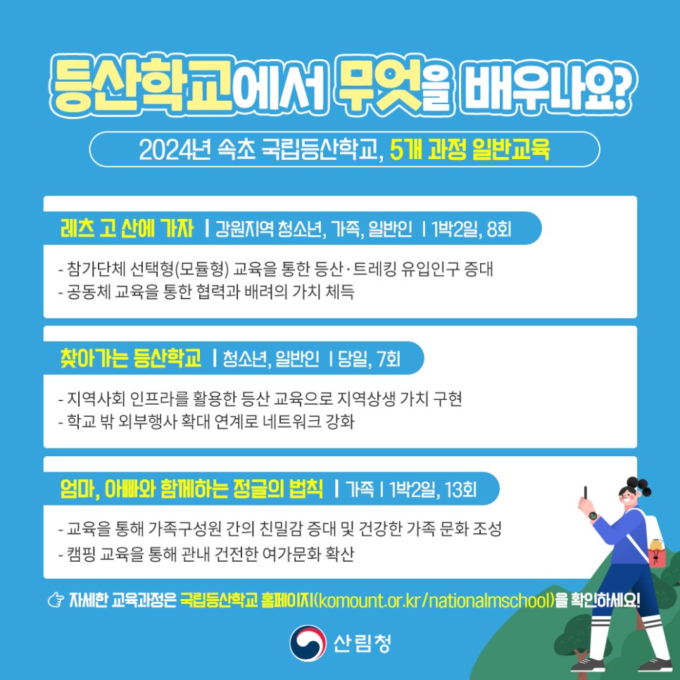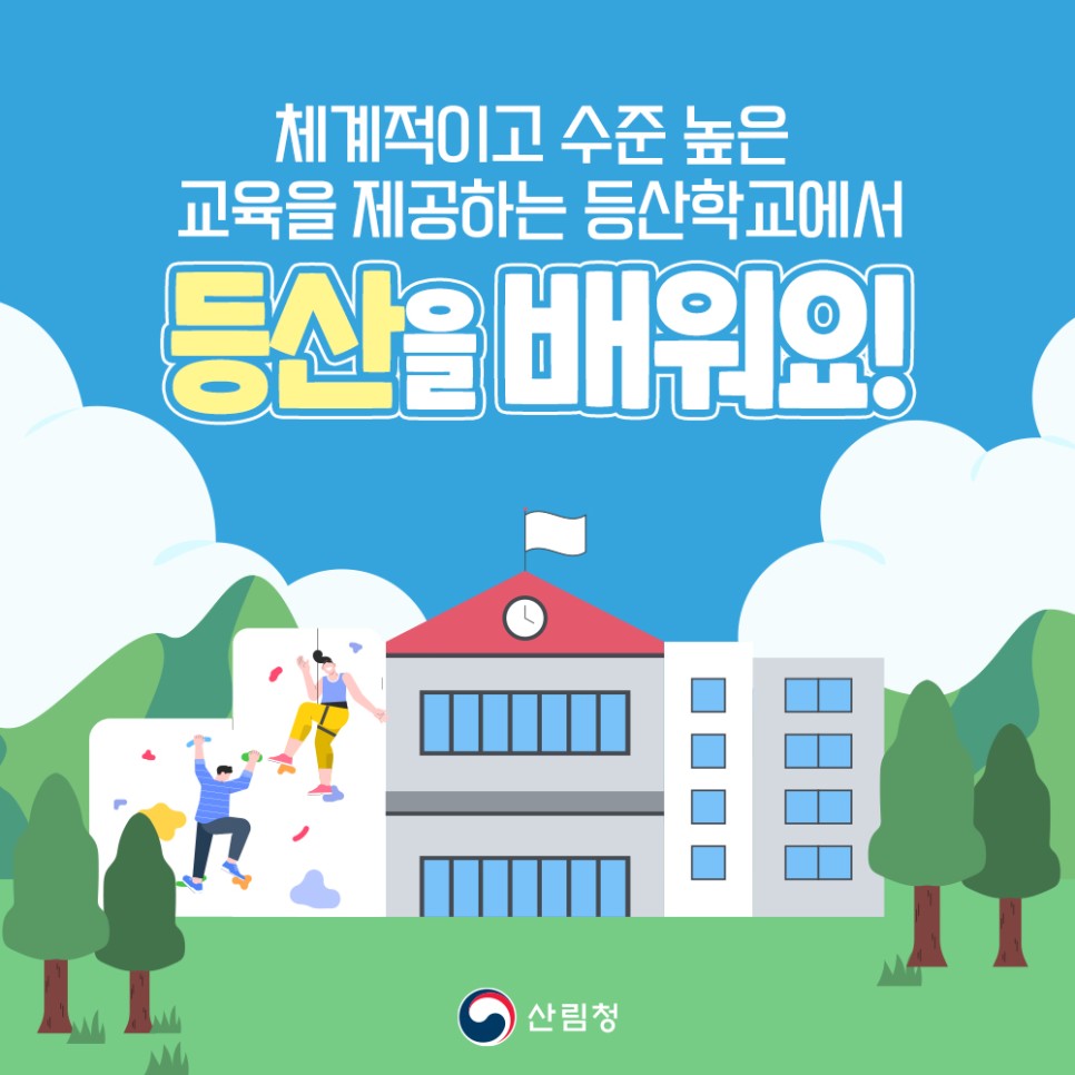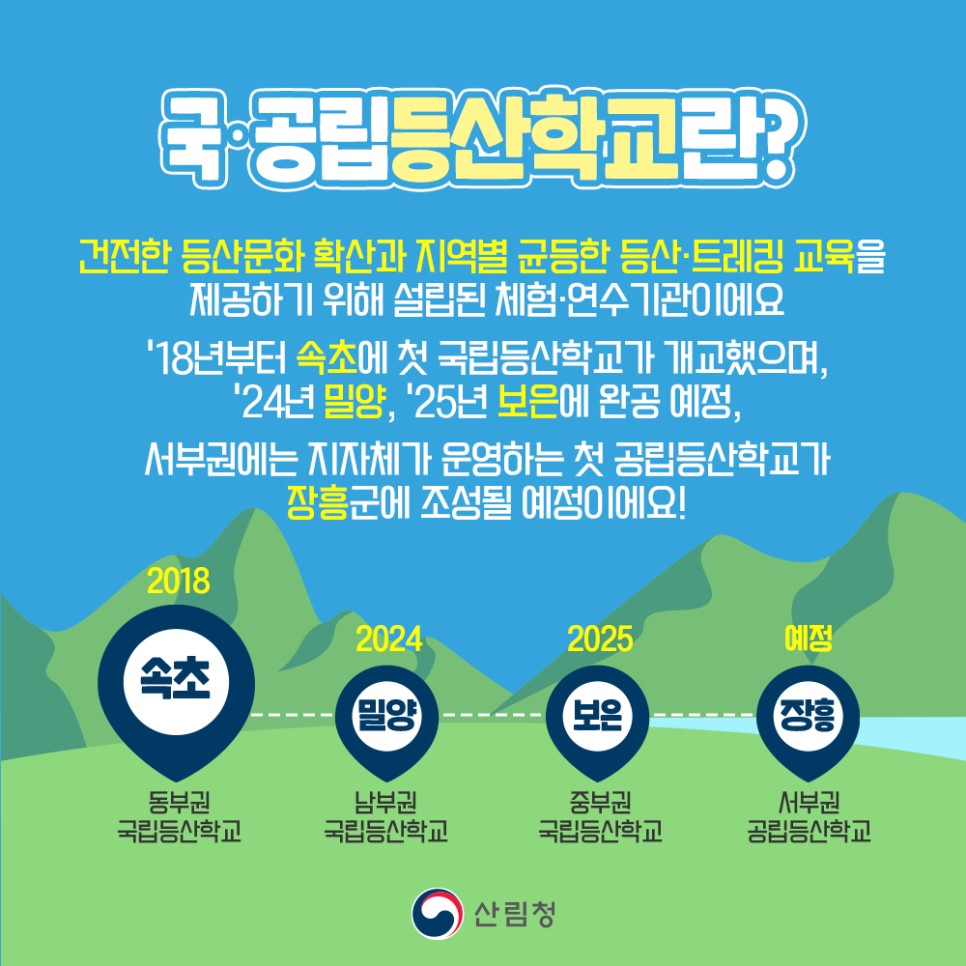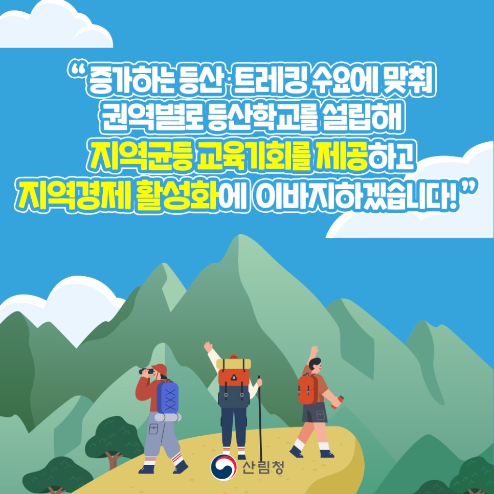 산림청은 “증가하는 등산·트레킹 수요에 맞춰 권역별로 등산학교를 설립해 지역균등 교육기회를 제공하고 지역경제 활성화에 이바지하겠습니다!”라고 밝혔습니다.