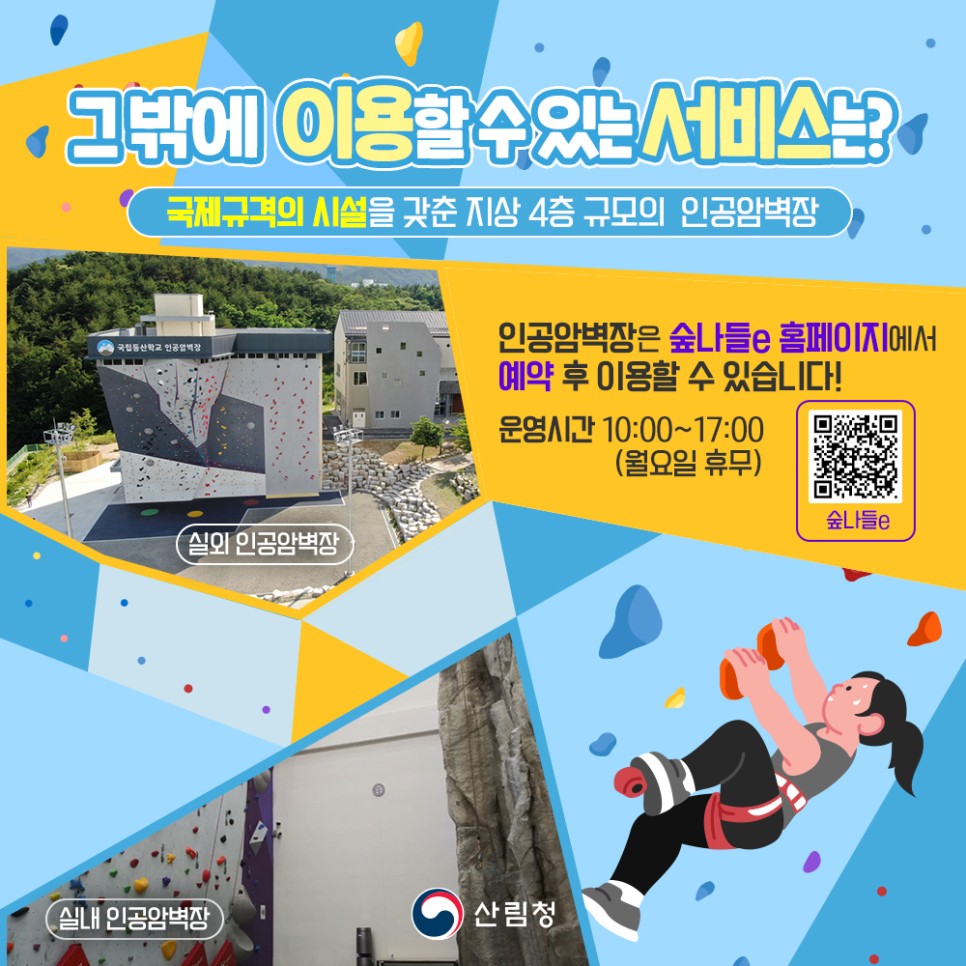 인공암벽장은 숲나들e 홈페이지(https://www.foresttrip.go.kr/index.jsp)에서 예약 후 이용할 수 있습니다!