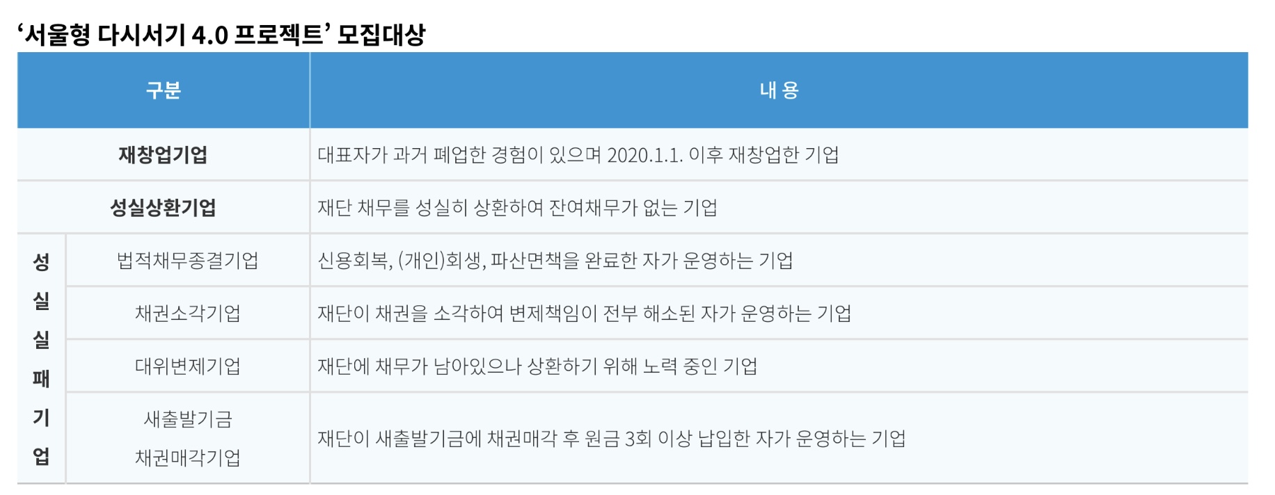 폐업 경험이 있는 ‘재창업기업’, 재단 채무를 성실히 상환 완료한 ‘성실상환기업’, 법적으로 채무상환의 책임을 면제받은 ‘성실실패기업’이 모집 대상입니다.