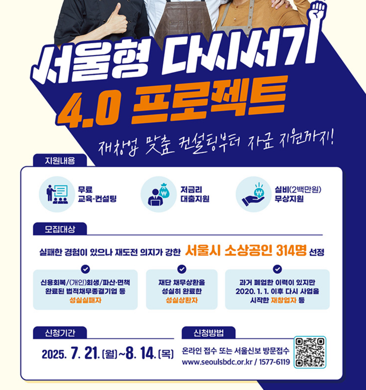 서울시는 소상공인의 재기를 돕는 ‘서울형 다시서기 4.0 프로젝트’ 하반기 참여자를 모집합니다.