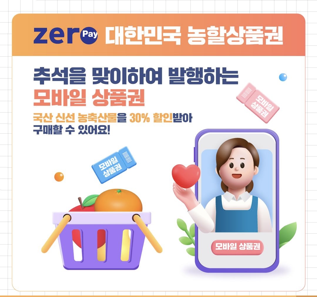 2024년 추석을 맞이하여 발행하는 모바일 상품권 국산 신선 농축산물을 30% 할인받아 구매할 수 있다고 합니다.