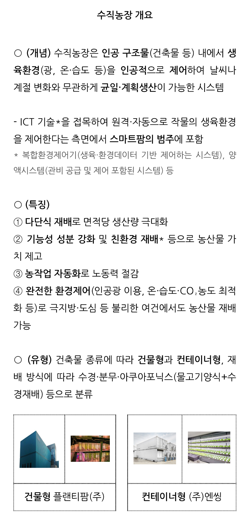 수직농장용 센서·ICT·로봇 고도화, 공장 폐열 활용 수직농장 운영실증 등 기술개발을 지원(2024∼, 산업부·농식품부)할 예정이라고 합니다.