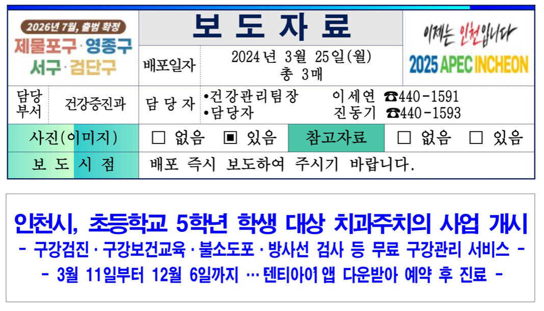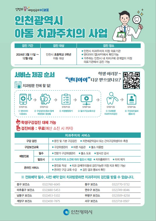 인천광역시는 2024년 3월 11일부터 12월 6일까지 관내 초등학교 5학년을 대상으로 아동 치과주치의 사업을 실시한다고 밝혔습니다.
