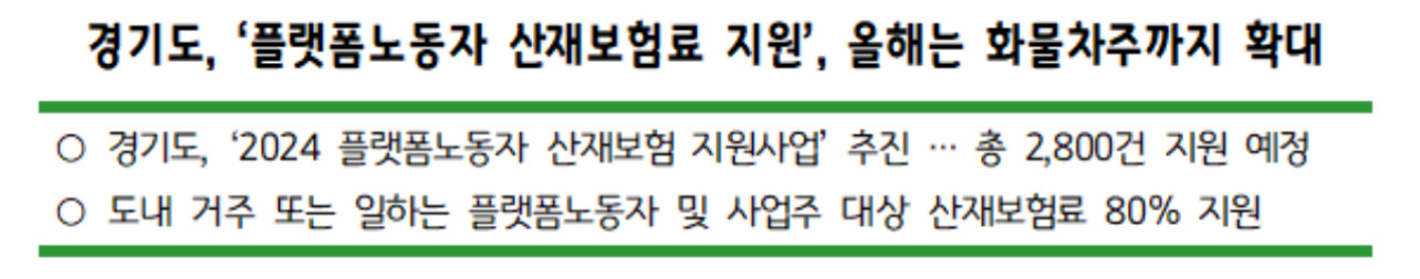 경기도가 배달이나 대리운전 등 플랫폼노동자의 산재보험료를 지원하는 가운데 2024년 올해는 지원대상을 화물차주까지 확대한다고 밝혔습니다.