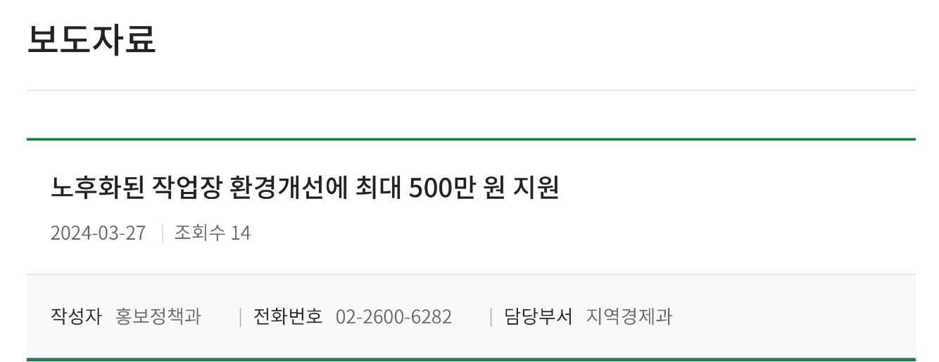 강서구 노후화 작업장 환경개선 지원금 모집대상은 구에 소재한 상시 근로자 수 10인 미만의 5대 제조업체이며 2024년 4월 16일까지 신청서와 사업자등록증 등 구비서류를 갖춰 구청 지역경제과로 방문해 신청하면 된다고 합니다.