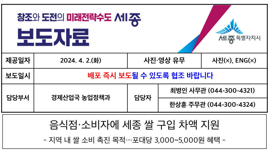 마지막으로 최민호 시장은 “이번 세종 쌀 구입 차액 지원은 지역 내 세종쌀의 소비를 촉진하기 위해 추진된다”며 “농업인과 소비자 모두를 위한 이번 사업에 관내 음식점과 시민의 많은 참여를 바란다”라고 말했습니다.