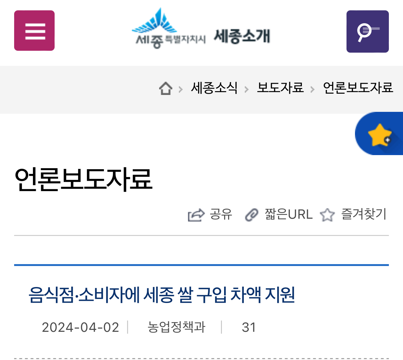 본 설명은 세종시 홈페이지 보도자료