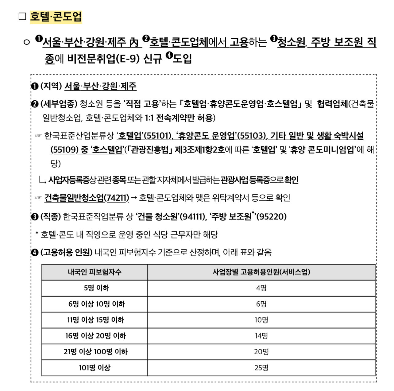 이에 서비스업으로 4,490명을 배정하여 그간 내국인 구인에 어려움을 겪었던 음식점업(한식업)과 호텔·콘도업 사업장에 대해 외국인근로자(E-9)를 배정할 예정이라고 합니다.